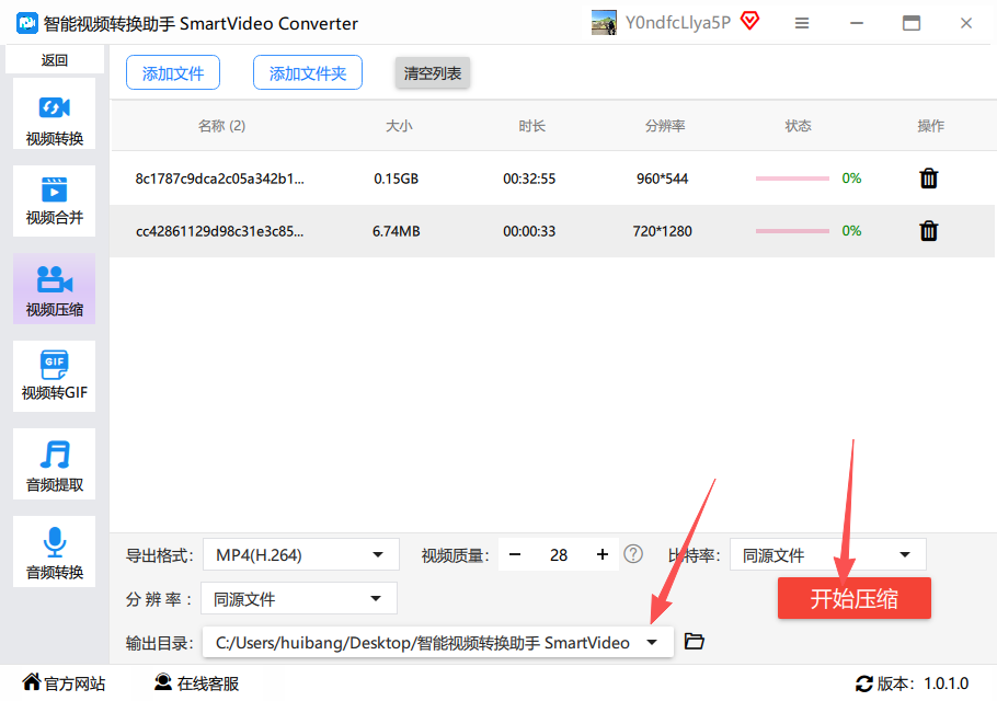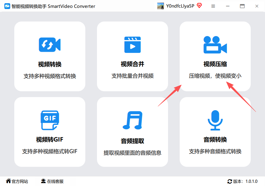 1.首先我们先去官网下载安装一个智能视频转换助手,安装好之后我们双击点进去,点击“视频压缩”