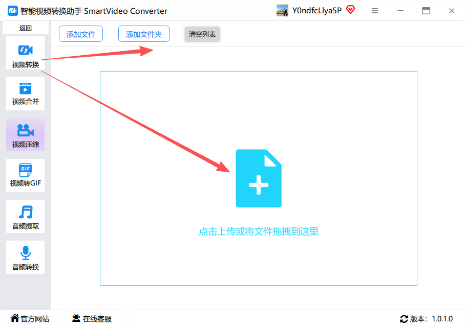 2.进来看到有添加文件和添加文件夹,还有拖拽文件,还可以直接拖拽视频进来,而且什么格式都可以的,支持批量