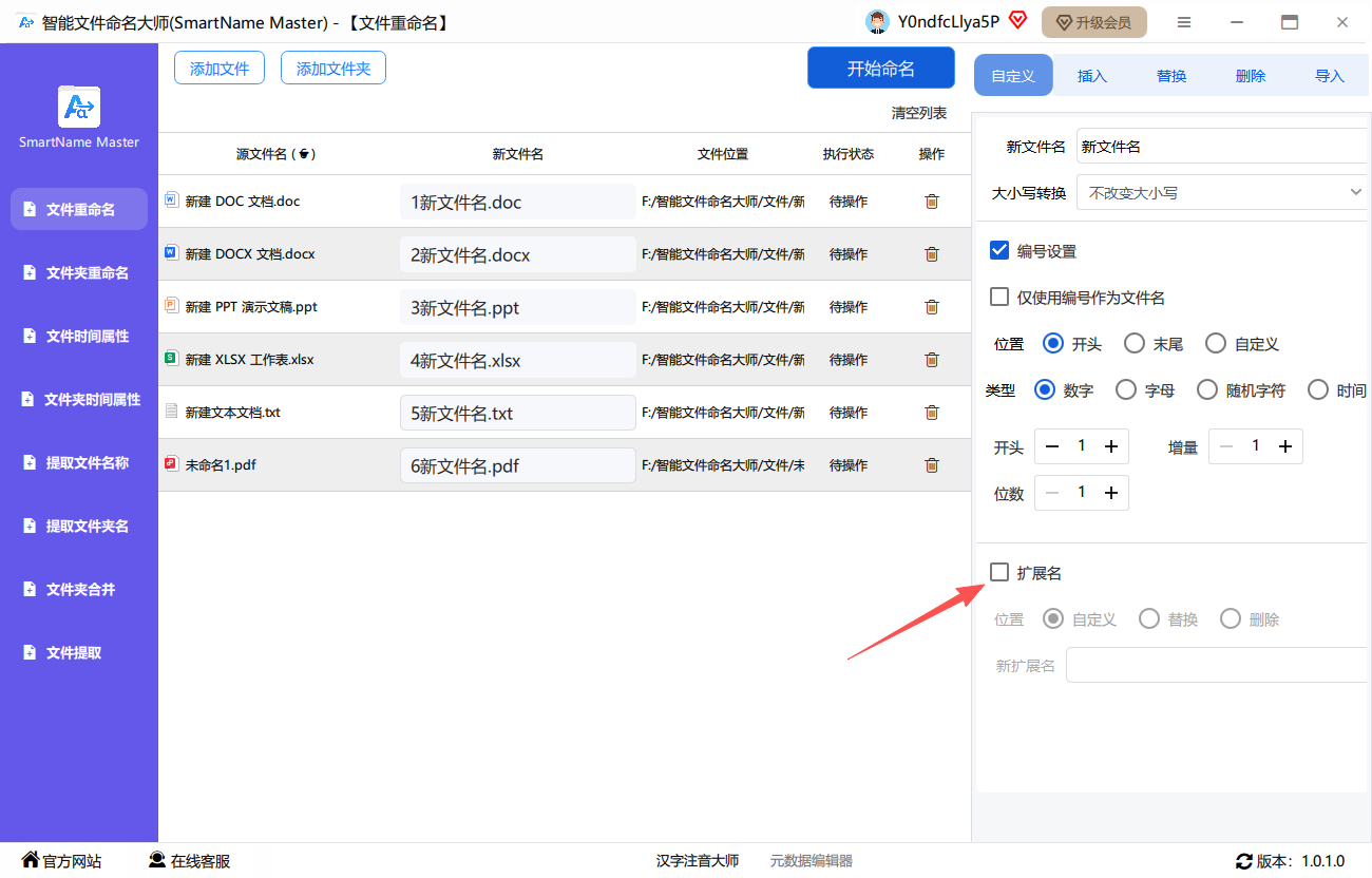 第二步、在右侧工作台中,在底部勾选启动“拓展名”。