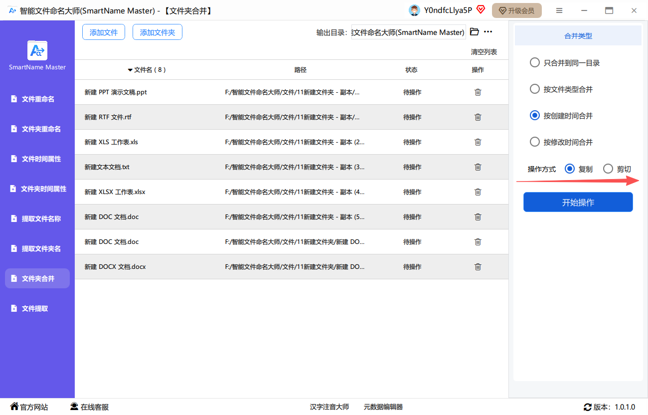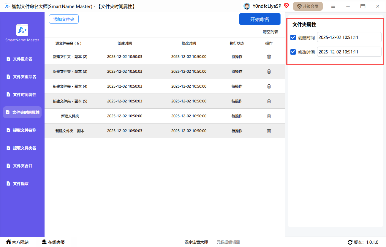 软件提供了「文件重命名」、「文件夹重命名」、「文件时间属性」、「文件夹时间属性」、「提取文件名称」、「提取文件夹名称」、「文件夹合并」和「文件提取」功能。