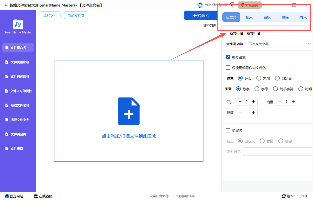 第二步、在右侧工作台中选择命名方式:自定义、插入、替换、删除、导入。