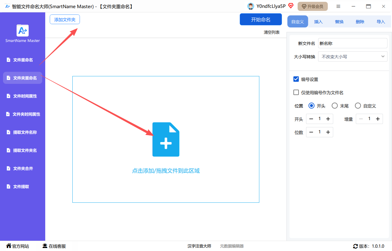 第一步、点击选择“文件夹重命名”功能,点击左上角的添加文件夹或者将文件夹选中并拖拽入内。